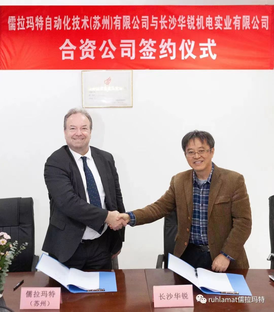 儒拉瑪特自動化技術(shù)(蘇州)有限公司與長沙華銳機電實業(yè)有限公司在長沙舉辦了合資公司簽約儀式,儒拉瑪特(蘇州)董事總經(jīng)理白世泰先生與長沙華銳總經(jīng)理王小明先生簽署合作協(xié)議。